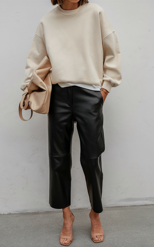 A beige oversized sweatshirt combined with sleek black leather cropped pants crafts an effortlessly chic business casual look. Nude heels and a matching beige handbag harmonize the ensemble, versatile enough for both office and evening.