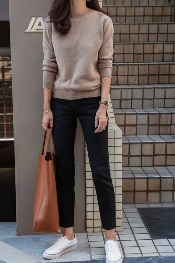 - Accessories: Beige tote and subtle gold jewelry seamlessly complement.