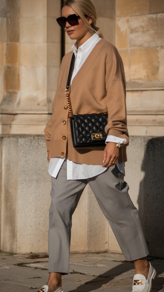 Embrace soft shades and diverse textures with this effortlessly chic layered outfit. The warm camel cardigan drapes over a crisp white shirt, setting a subtle contrast with contemporary cropped gray trousers. Luxurious accents such as a quilted handbag and oversized sunglasses inject a sense of sophistication, perfectly suited for a relaxed yet elegant office setting or a casual networking lunch.