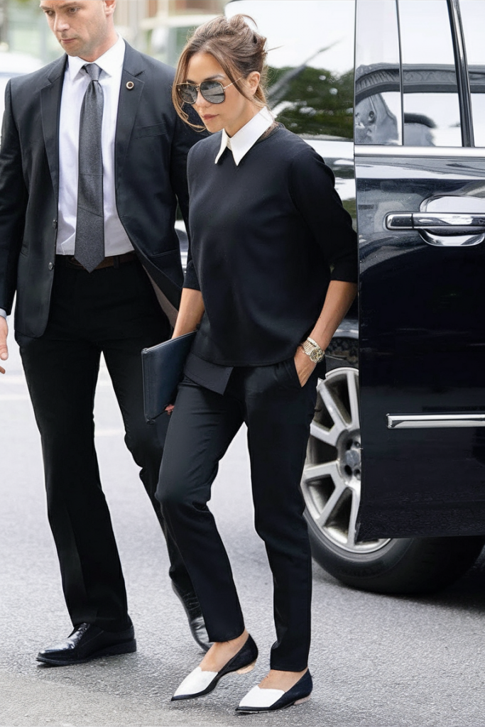 - Shoes: Pointed black flats or heels complete the powerful look.