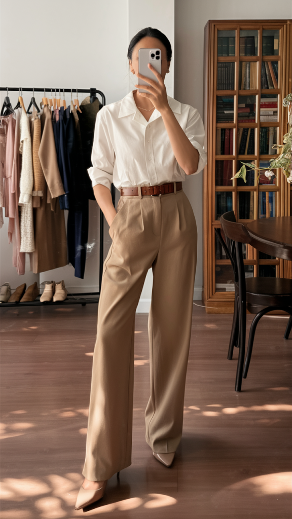 Exemplifying minimal sophistication, this ensemble centers on a pair of high-rise beige trousers paired with a crisp white button-down. Cinched by a tan belt with a gold accent, the waist gains definition, while pointed nude heels lengthen the legs, creating a timeless ensemble suitable for varied corporate settings. This combination suits professionals who favor graceful simplicity.