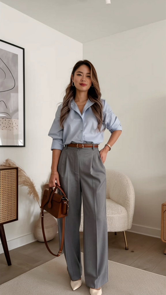 This ensemble integrates delicate blue tones with neutral grays for a polished yet welcoming look. A structured blue blouse tucked neatly into wide-leg high-waisted gray pants produces an elegant, elongated silhouette. Accents like a tan leather belt with designer details and pristine white heels complete the spring-ready outfit, appropriate for client meetings or midweek office engagements.