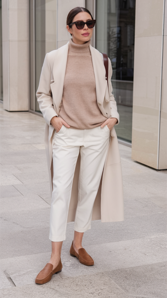 This soft beige monochrome outfit smartly mixes textures for an understated yet compelling look, featuring a structured coat, a slim turtleneck, and cropped white trousers. Brown suede loafers add warmth while black oversized sunglasses introduce a hint of drama, making it perfect for formal office settings or networking events.