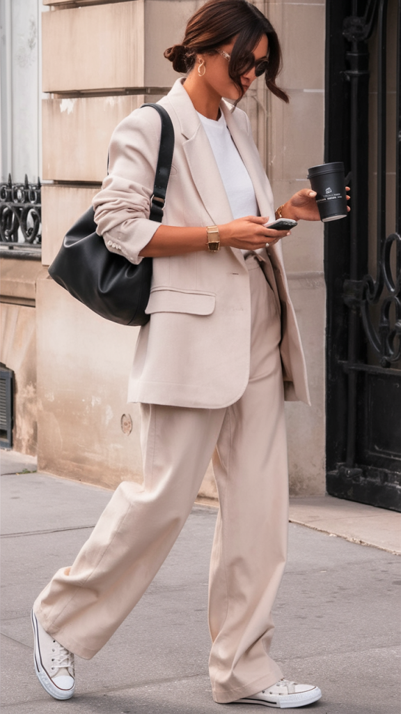 This look reimagines power dressing by pairing a sharp white blazer with beige wide-leg trousers and a casual white tee. White sneakers add modern edge, supported by a black leather tote and delicate gold jewelry for balance—perfect for professionals balancing office meetings and running errands.