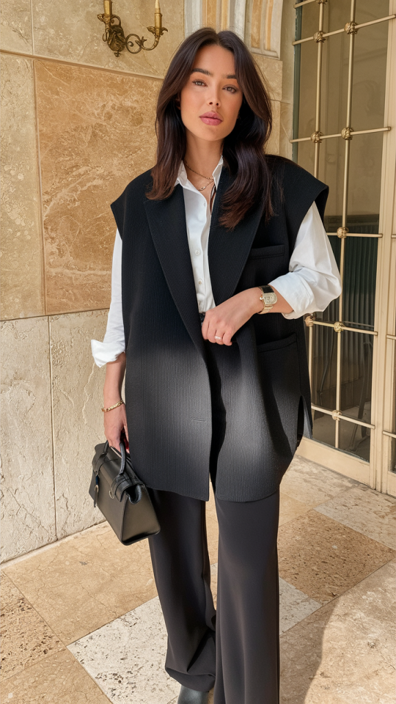 - Vest: Oversized, black with pinstripes for contemporary tailoring.