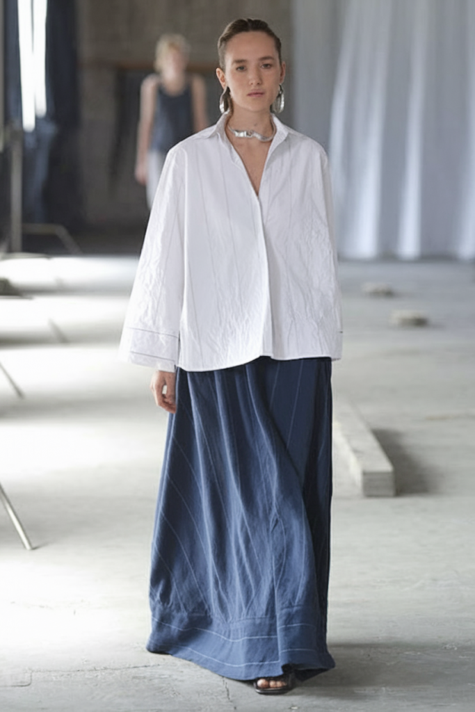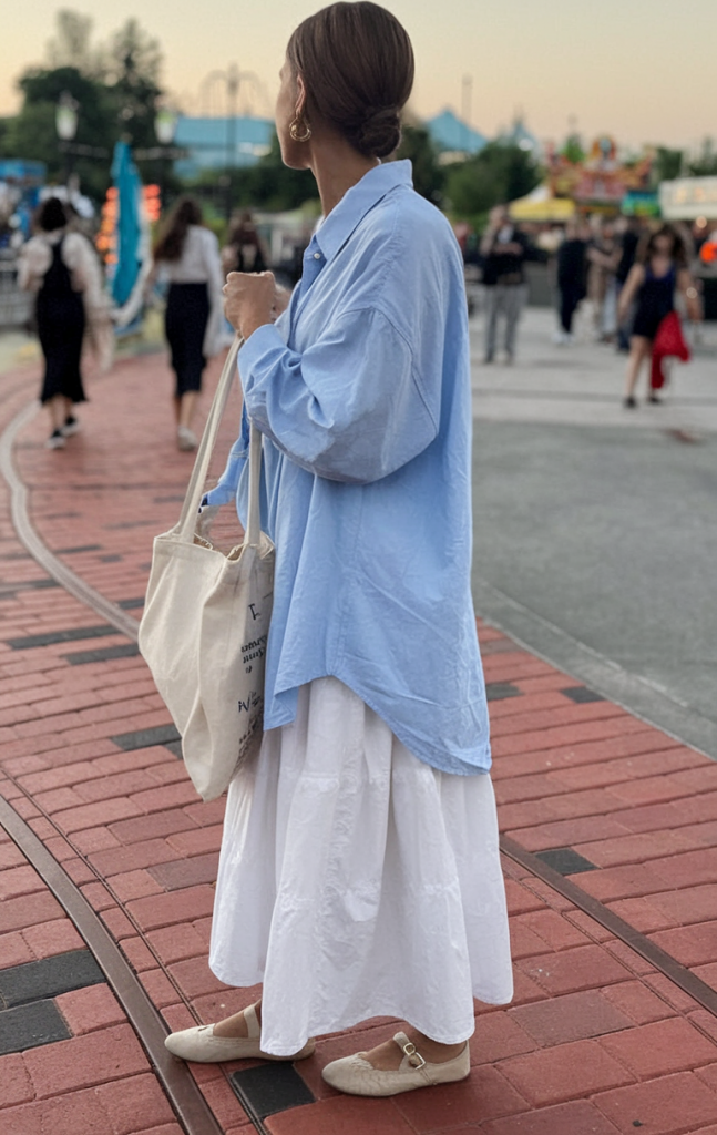 An oversized powder blue button-down paired with a flowing white midi skirt makes a gentle but impactful statement. This look encapsulates relaxed femininity suited for garden parties, pop-up markets, or leisurely city strolls—blending comfort and grace seamlessly.