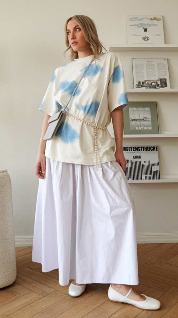 This look effortlessly mingles the fun of oversized cloud-pattern tie-dye tees with the crisp structure of an ample white skirt, balancing whimsy and sophistication. It suits daytime social events and creative environments.