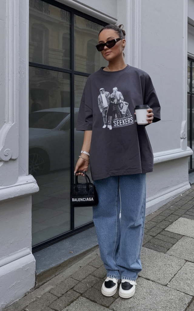 The perfect streetwise cool is captured with a boxy charcoal graphic tee and loose, soft-wash jeans. This ensemble channels casual comfort and nostalgic charm with contemporary touches like chunky sneakers and iconic micro bags.