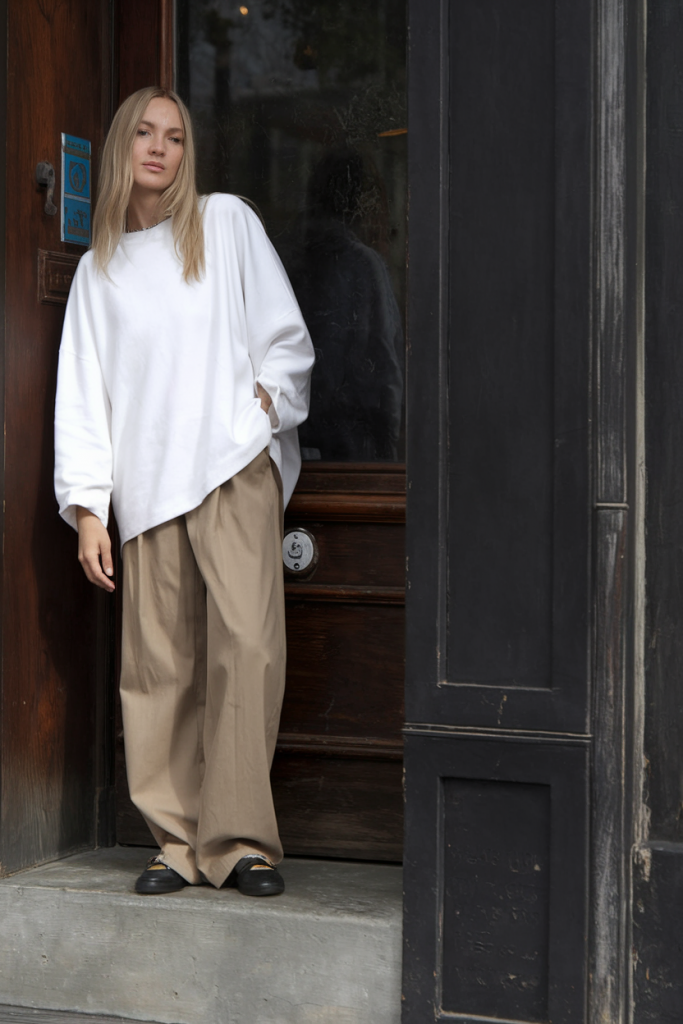 This look features a white oversized tee paired with wide-legged khaki trousers evoking a refined explorer aesthetic. It’s minimalist, timeless, and perfectly apt for art gallery visits, creative workspaces, or laid-back evenings.