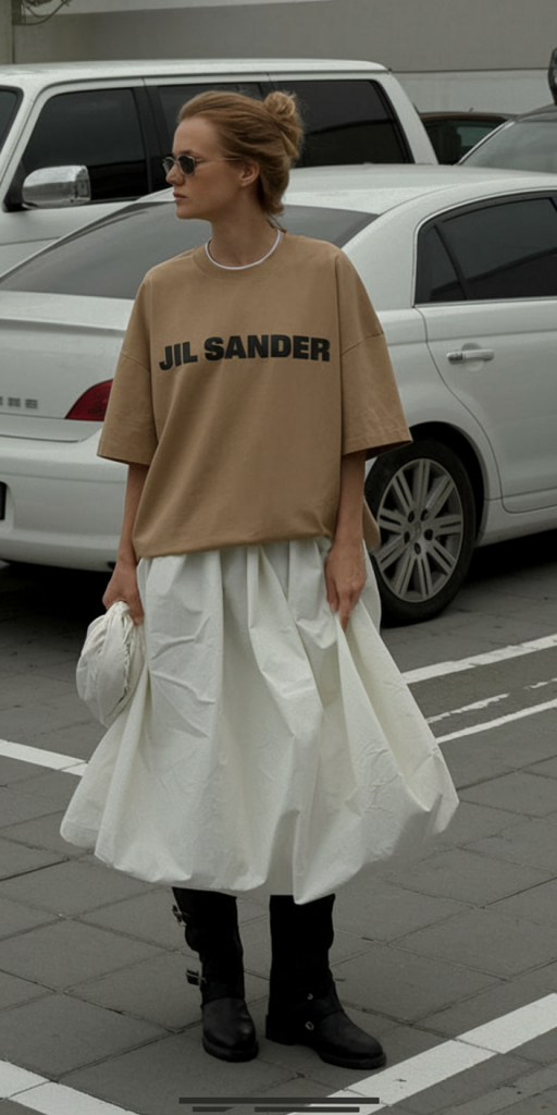 Layering a sandy brown graphic oversized tee atop a structured white pleated skirt and grounding the look with chunky black moto boots creates an intentionally contrasting ensemble—a modern rebel’s summer outfit.