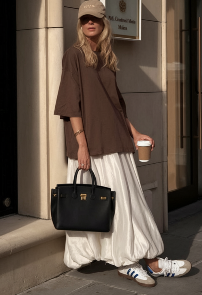 • Accessories: Taupe baseball cap paired with a classic black handbag for a polished finish.