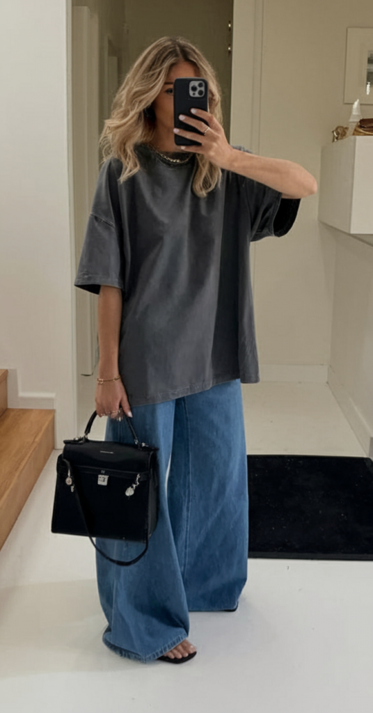 Grunge Revival: Charcoal Tees and Wide-Leg Denim