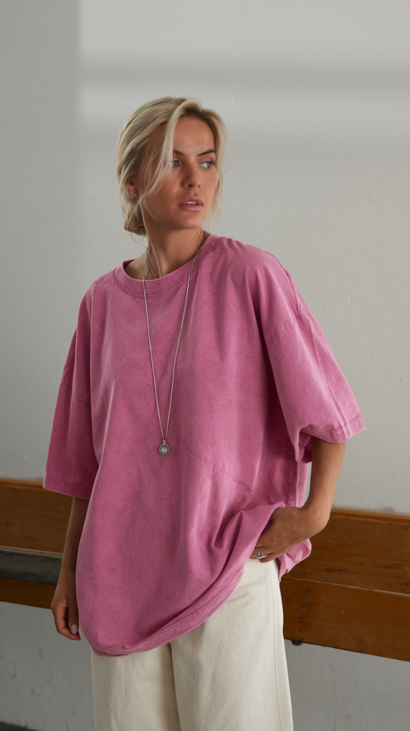 Bright and breezy, this outfit uses an oversized faded pink tee coupled with cream wide-leg trousers to create a casual yet eye-catching summer statement. The worn-in fabric texture adds charm and makes it extremely photogenic.