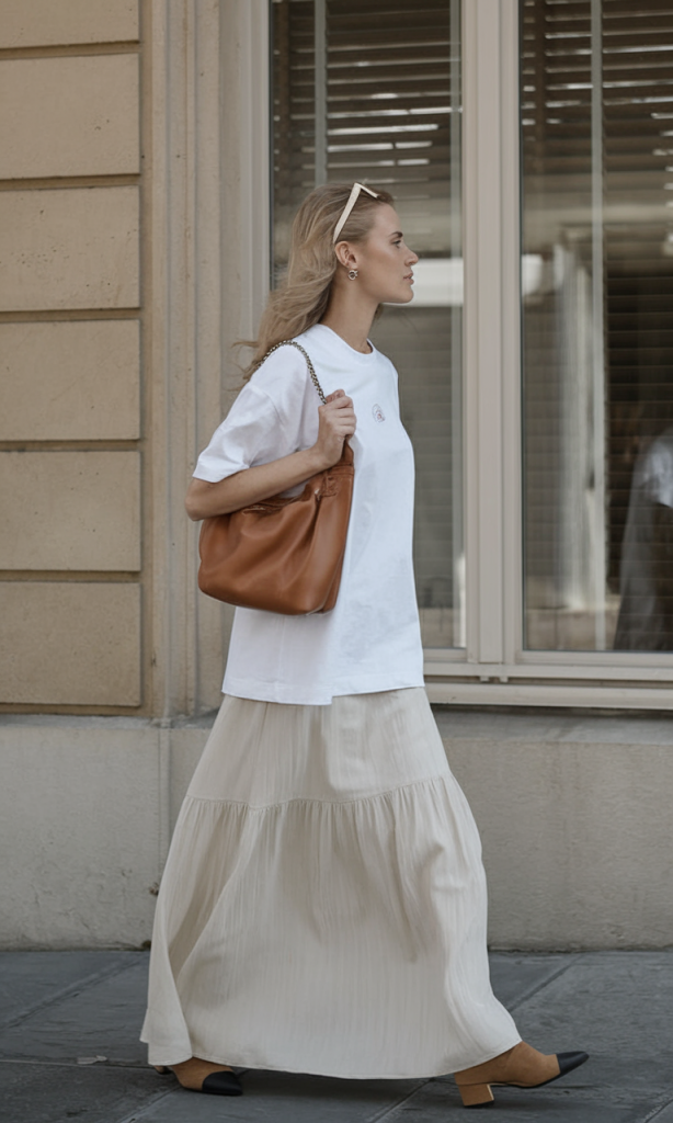Convey timeless elegance effortlessly by pairing an oversized pristine white tee with a tiered maxi skirt featuring soft stripes. This street style favorite blends relaxed ease with feminine charm, accentuated by tan leather accents and two-tone cap-toe flats that whisper sophistication.