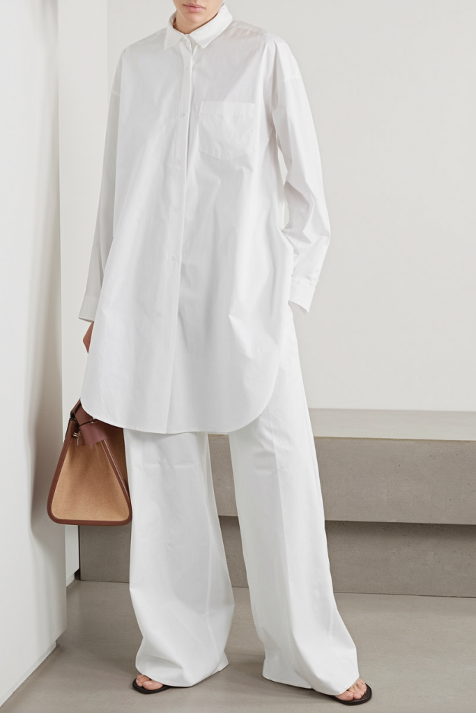 • Shirt: Longline white button-down with stand collar, flowing with understated grace.