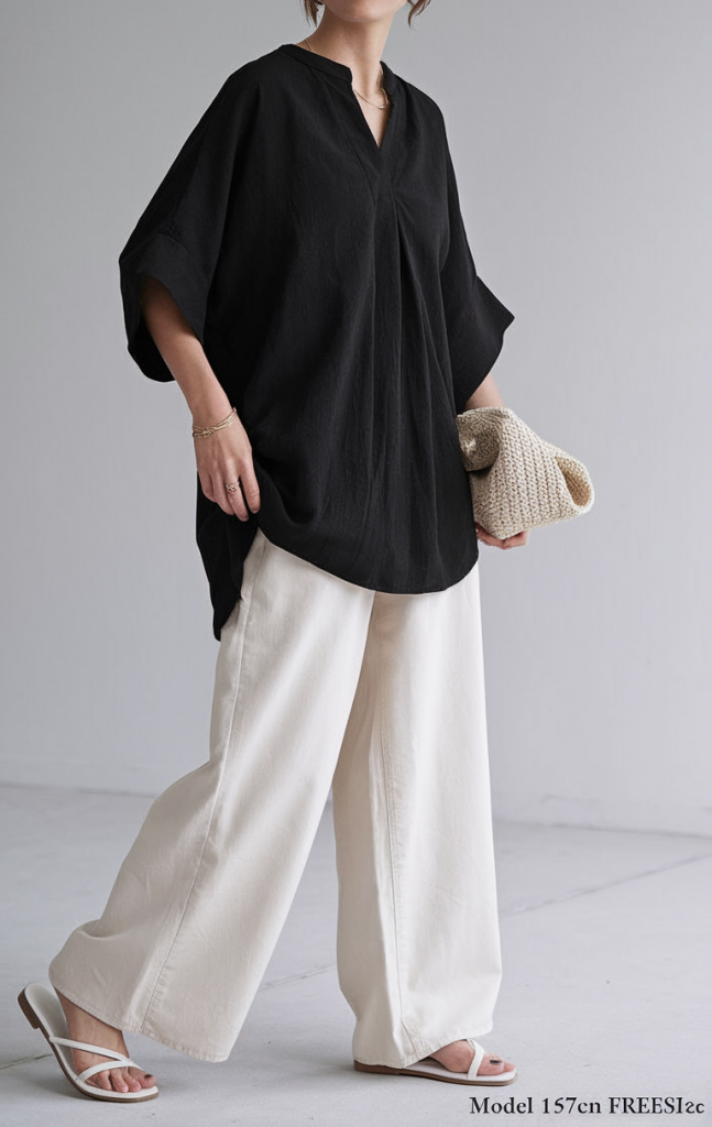 Perfect for casual excursions like farmers’ markets or lunch dates, this ensemble features an oversized black tunic with batwing sleeves paired with off-white wide-leg pants. Relaxed white thong sandals complete the neutral ensemble.