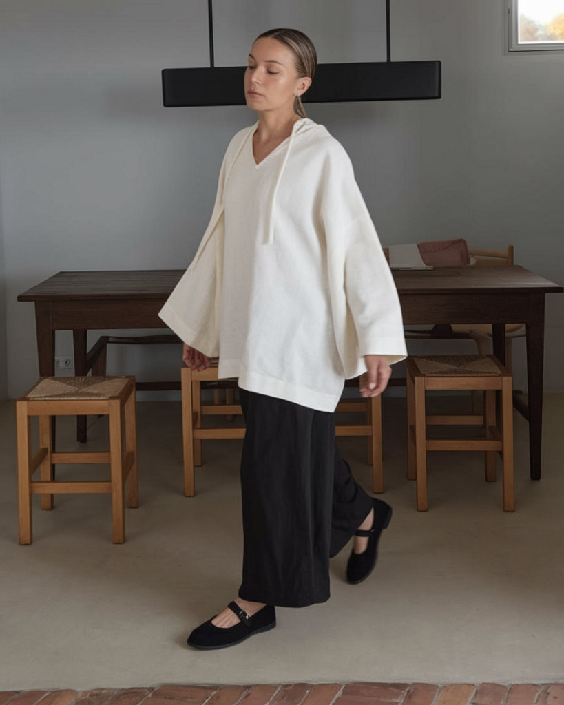 Combining structure and fluidity, this look pairs a wide-sleeved cream tunic hoodie with black cropped wide-leg trousers that exhibit a monkcore sensibility. Perfect for gallery visits or weekend markets, it champions natural materials and comfort.