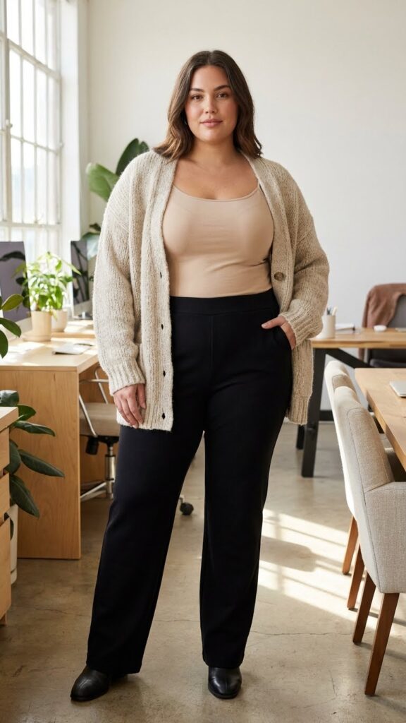 If you haven’t explored ponte pants yet, they’re a revelation for plus size office wardrobes—looks tailored but feels like leggings. Pair them with a luxurious oversized cardigan made of soft knitwear for those days prioritizing comfort without sacrificing style.