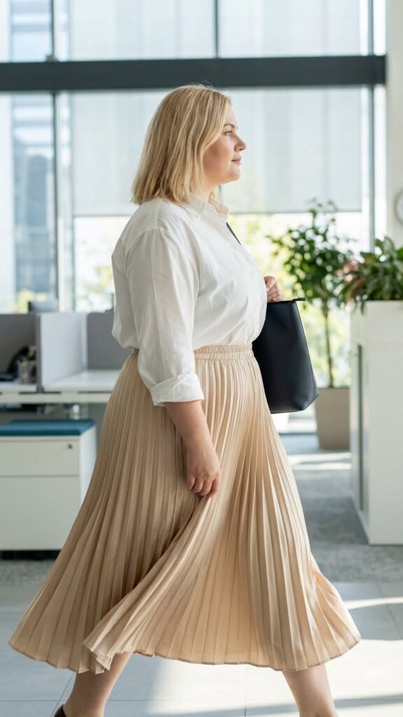 Pleated skirts bring inherent grace with their flowing vertical lines, which flatter plus size silhouettes beautifully. Pair a pleated midi skirt with a button-down shirt partially tucked in for a mix of classic professionalism and relaxed style.