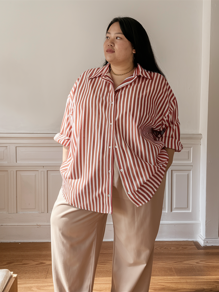 A roomy button-down shirt with red and white stripes brings a fresh, lively vibe to spring casual curvy ensembles. Coupled with creamy beige pants, this outfit strikes the perfect balance between color and neutrality. The shirt’s flowing silhouette gently embraces curves, delivering comfort and style for midsize and plus sizes alike. Rolled sleeves convey an easygoing but chic attitude, while straight-legged trousers ease movement and elongate. This combination is a flawless choice for brunch gatherings or smart-casual office days where polish meets ease.
