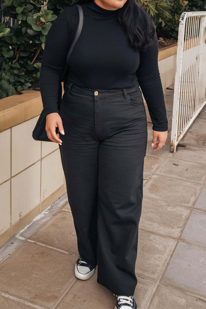 This minimalist, monochromatic ensemble works seamlessly for work or casual settings within spring curvy fashion. A fitted black turtleneck flatters the upper frame while wide-leg pants lend movement and elongate. Paired with classic Converse, this look exudes casual chic, perfect for apple and rectangular body types emphasizing subtle curves.