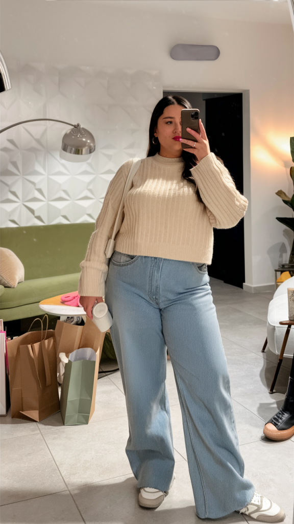 - Cropped cream sweater: Cozy ribbed texture with elegant simplicity.