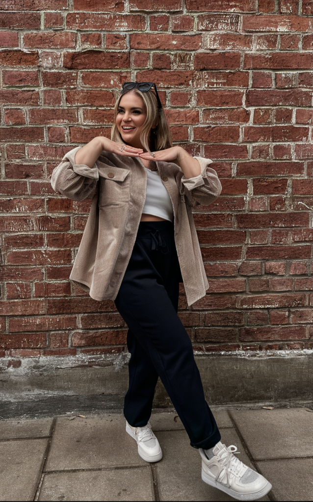 Corduroy Beige Overshirt with Fitted Black Pants and Sneakers