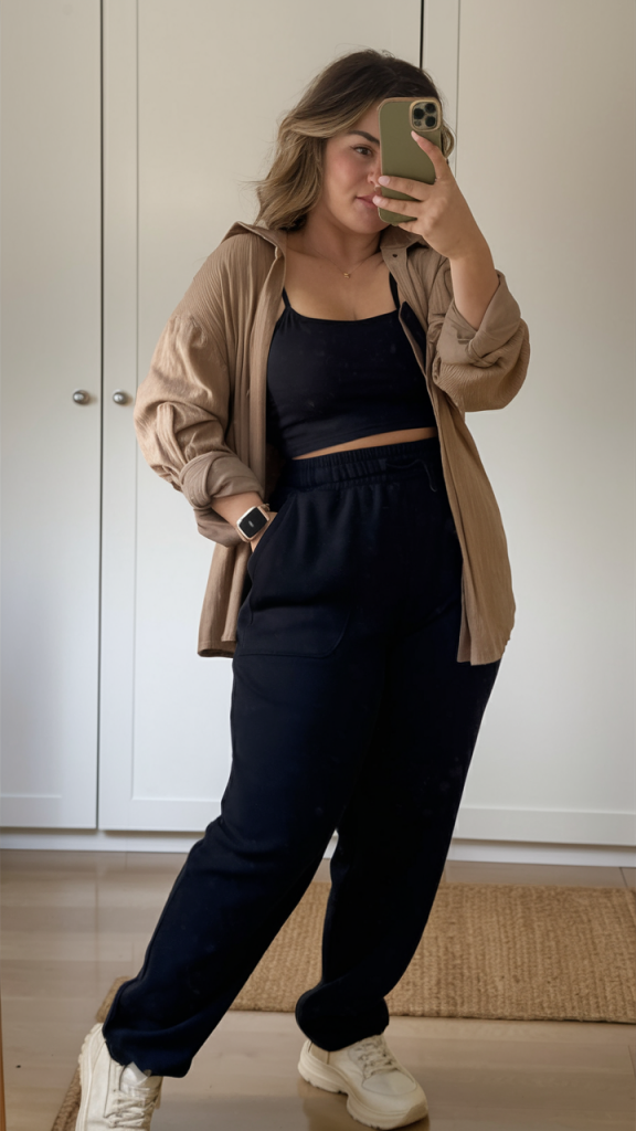 Elevate casual athleisure with this fresh ensemble featuring a warm rust-colored overshirt layered atop a fitted black crop top and matching black joggers. The jogger’s comfortable cut works beautifully with the crop top’s defined waist, while the rust overshirt offers texture and color warmth. Ideal for busy weekends or relaxed errands.