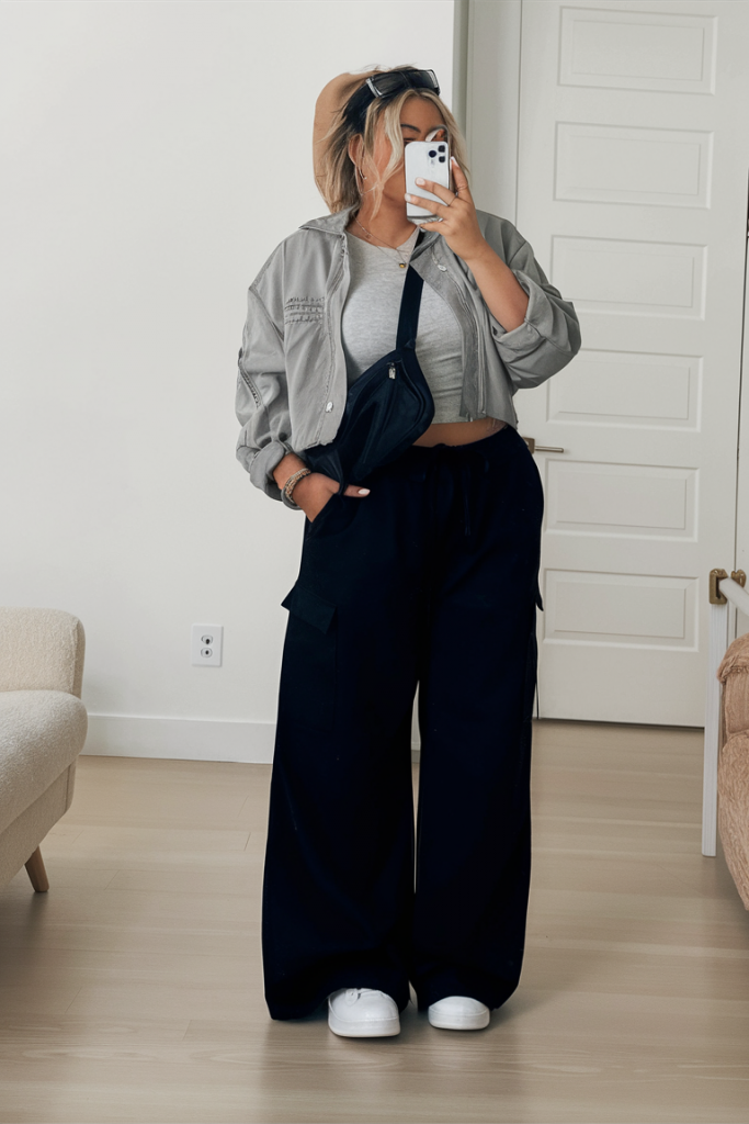 This chic, street-savvy outfit blends a classic cropped denim jacket with flowing black wide-leg pants, anchored by a neutral gray crop top. This ensemble enhances curves and elongates the legs, proving perfect for casual luncheons or relaxed daytime events.