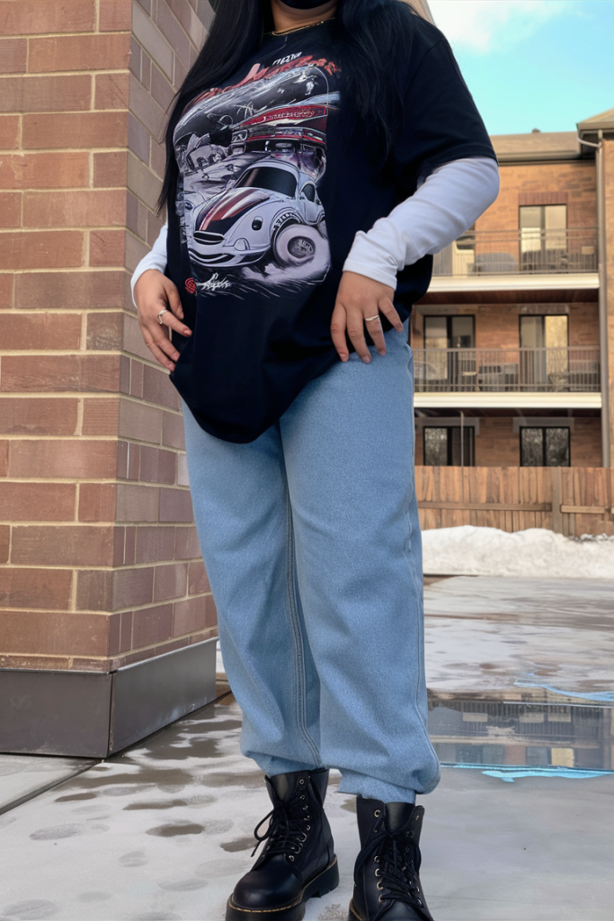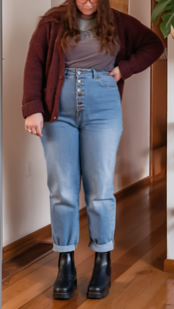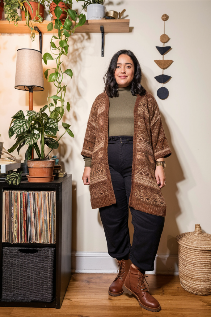 Perfect for shorter curvy frames, this look mixes vintage-influenced pieces with contemporary flair. A lively graphic tee paired with a warm, earthy brown cardigan creates contrast and coziness. High-waisted cuffed jeans elongate the legs, while sturdy black leather boots ground the outfit, ideal for an afternoon picnic or casual bookstore visit.