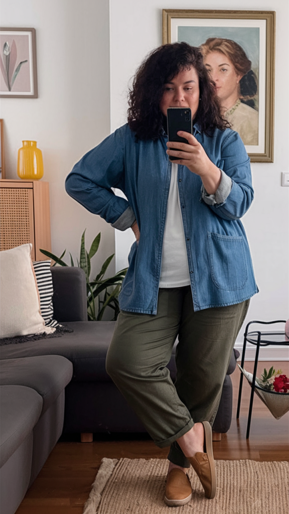 Timeless Denim Overshirt with Tailored Khaki Pants and Slip-Ons