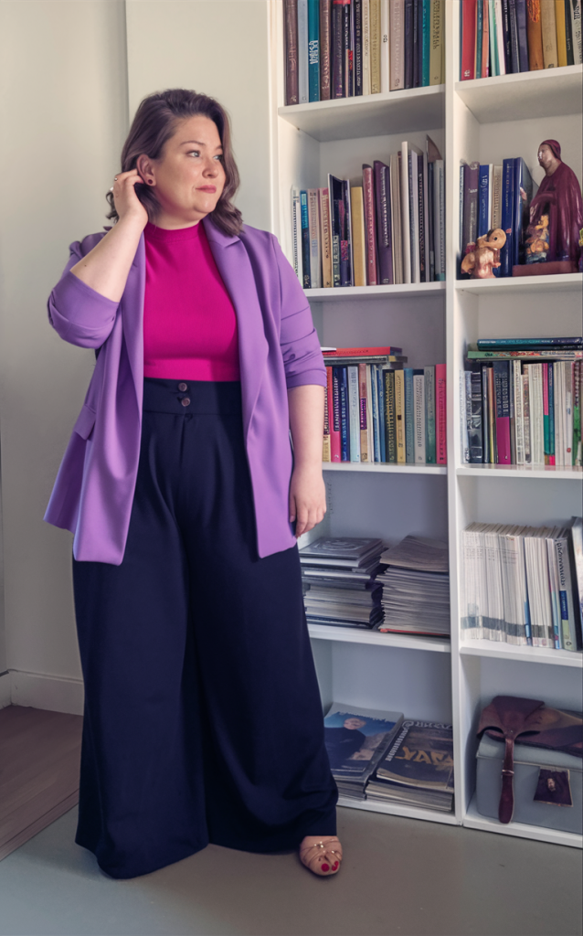 Make a bold statement at work or formal events with this purple blazer teamed with a striking fuchsia top and flowing black wide-leg pants. The blazer lends structure while the bright top injects playful contrast, creating a modern yet polished silhouette.