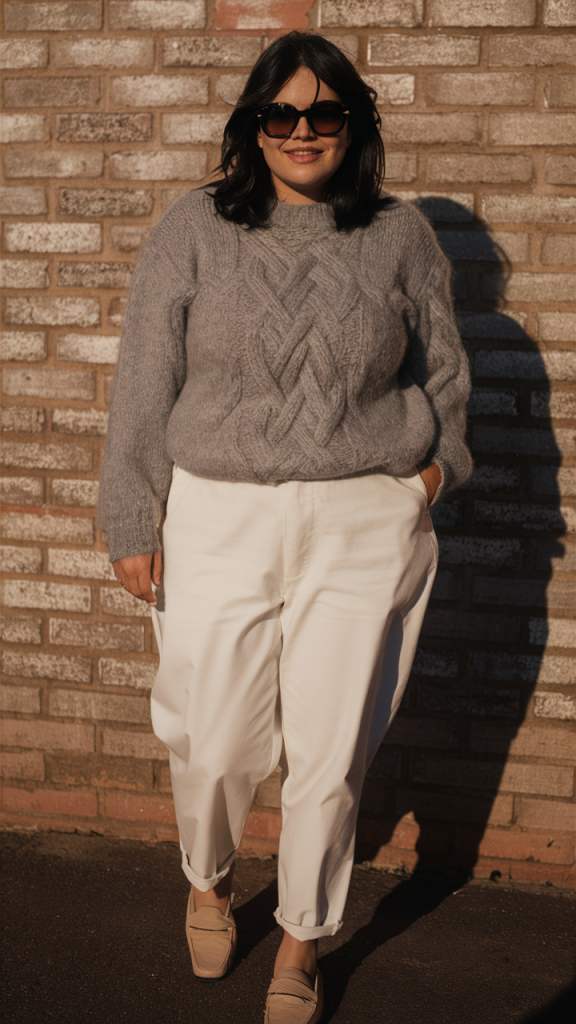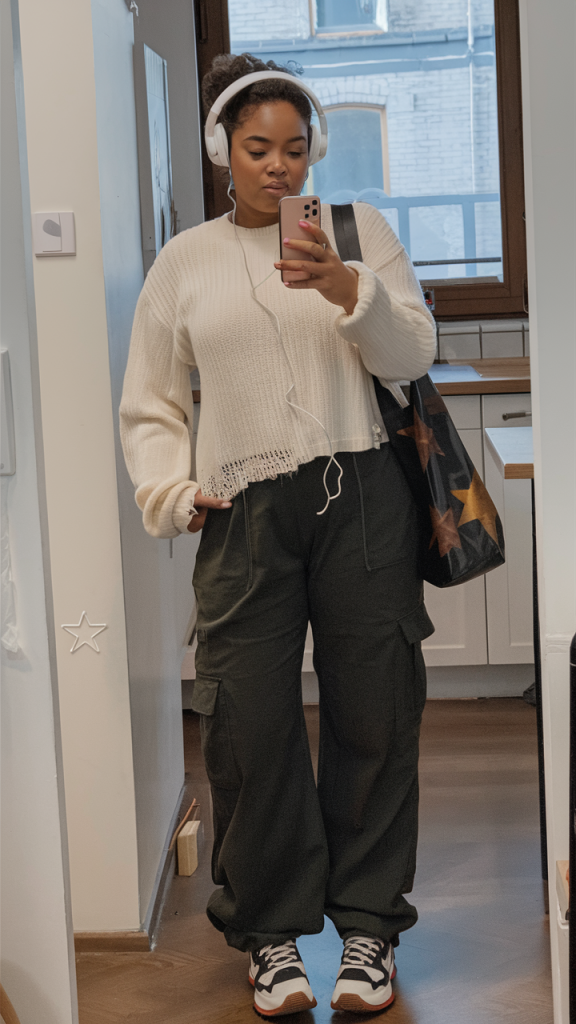 The utility trend continues to dominate spring styles for plus-size curvy wardrobes, and this cropped sweater with olive cargo trousers exemplifies it brilliantly. The chunky knit adds texture and depth, while a cropped hem accentuates the waist, flattering hourglass and pear silhouettes. The green cargo pants provide a functional yet trendy edge, with roomy pockets and a tapered fit that complements the oversized sweater’s relaxed feel. Perfect for casual days out or errands, this look merges comfort with a fashionable grit.