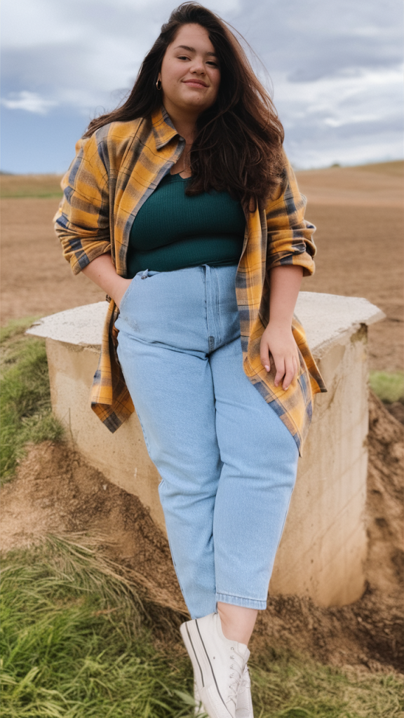 Tip: Wear the plaid open or tie at the waist for shape. Keep accessories relaxed to align with the casual vibe. A small backpack enhances functionality.