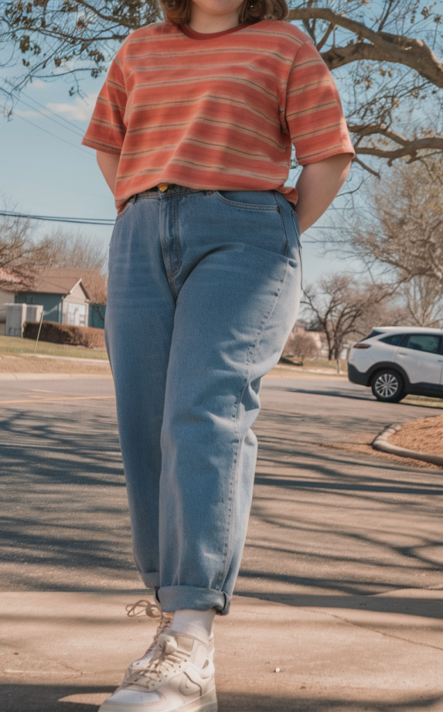 This cheerful coral striped crop paired with cuffed denim epitomizes laid-back, comfy midsize spring style. White sneakers ground the look, perfect for sunny strolls or first-spring errands.