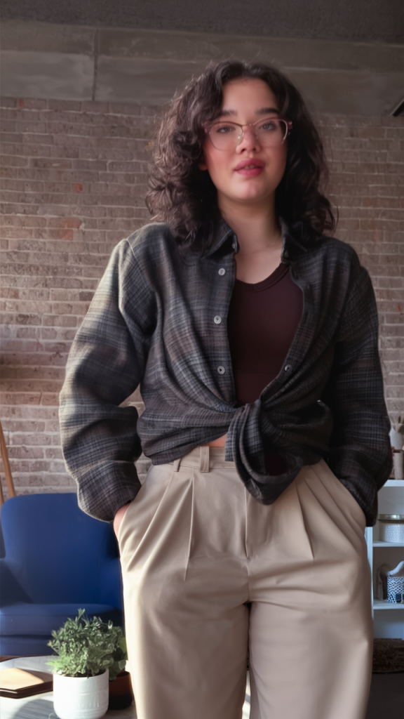 Plaid Shirt Tied at Waist with Beige Pleated Pants