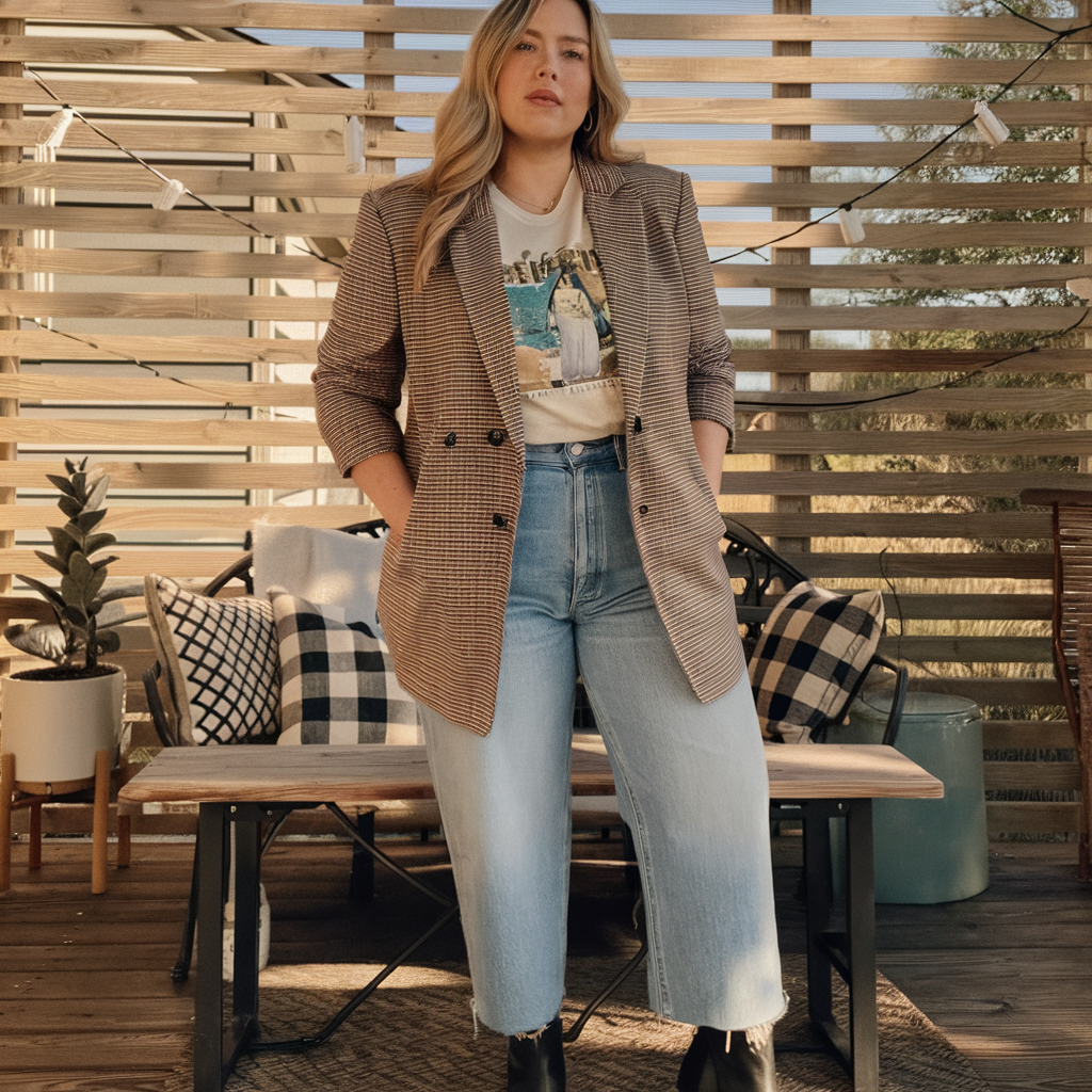 This smart-casual pairing effectively combines a playful graphic tee under a structured houndstooth blazer, paired with cropped light wash jeans and sleek black ankle boots—ideal for spring brunch or casual business events.