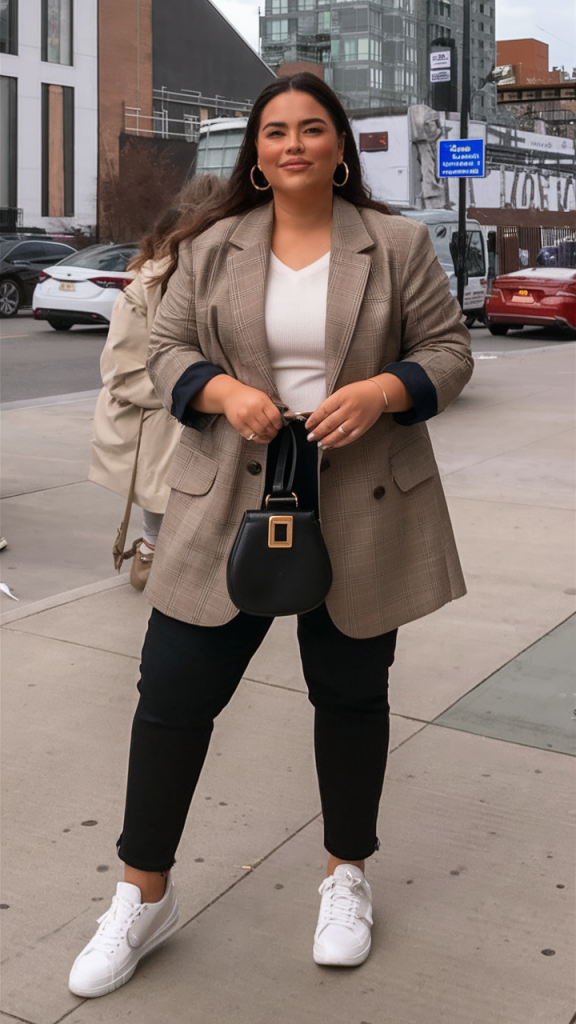 Cleanup your workwear with this combination featuring a tailored plaid blazer, black slim pants, and white sneakers. The look merges professionalism with modern casual ease, ideal for city settings or business-casual offices.