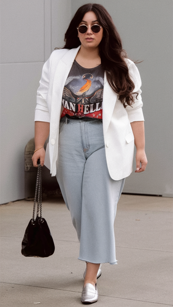 Elegant White Blazer Over Graphic Tee and Cropped Denim