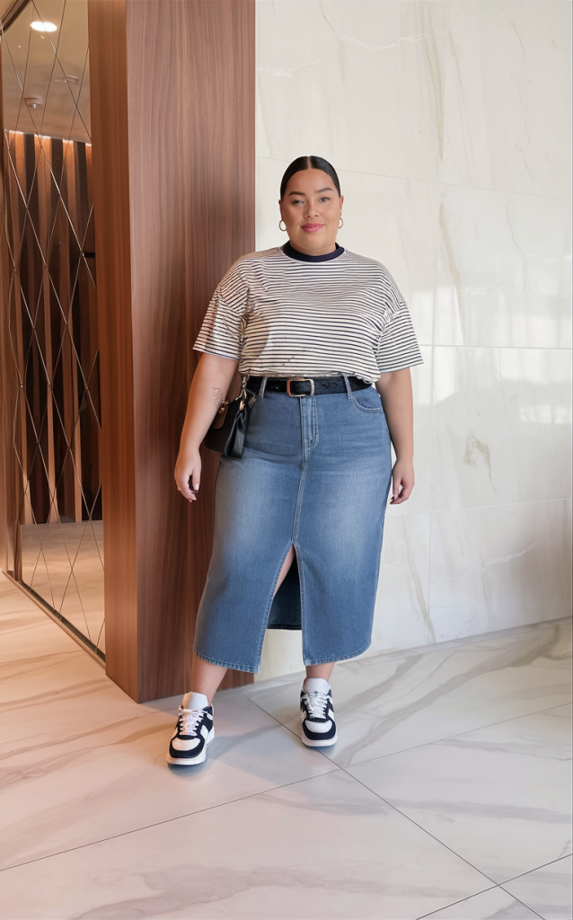 A timeless combo mixing a horizontal striped tee with a high-waisted denim skirt delivers effortless spring styling for curvy plus-size figures. The waist-cinching belt and side slit in the skirt add subtle definition and movement. Black sneakers contribute a casual vibe for daytime wear.