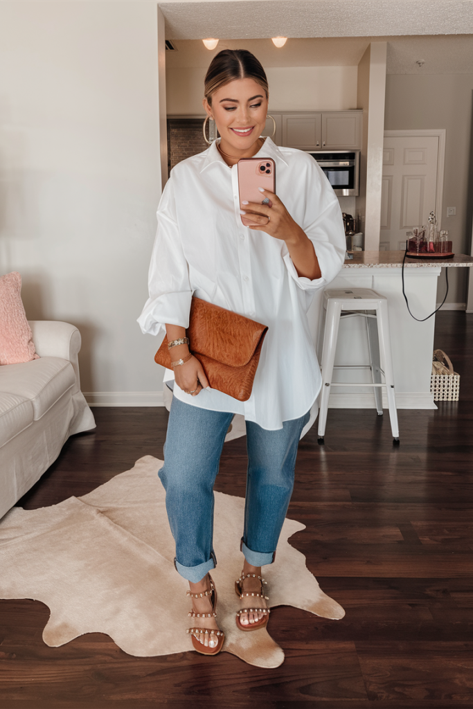 This easy ensemble offers a refined casual look with an oversized white shirt and cuffed jeans, balanced by studded sandals for a subtle edgy touch. Ideal for brunch or weekend errands.