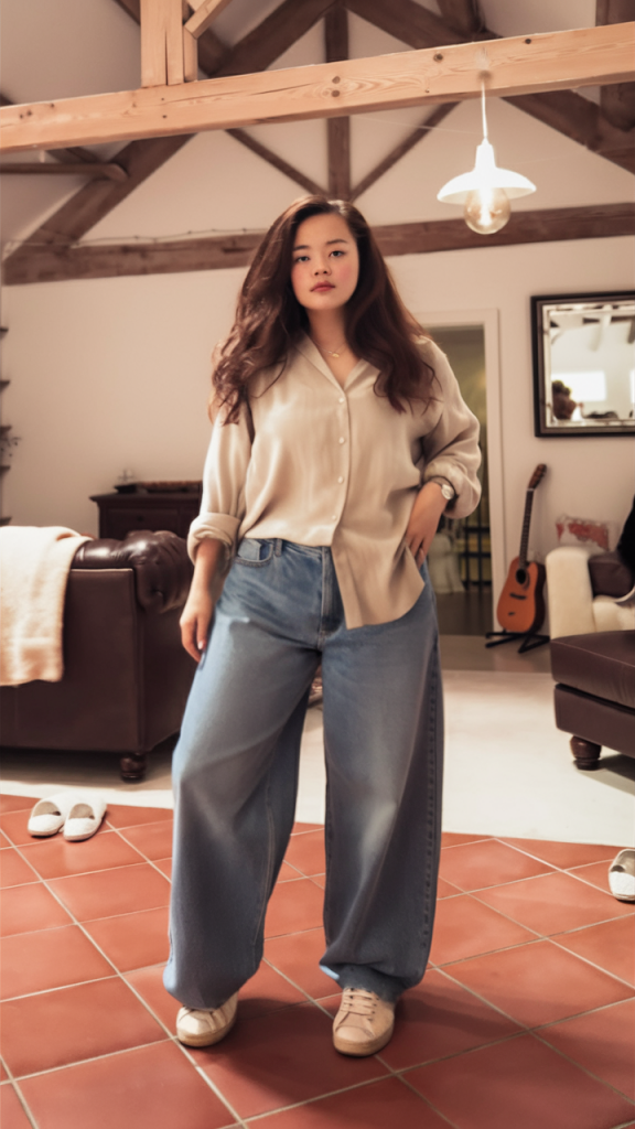 Wide-leg jeans have surged in popularity for spring, especially within midsize curvy styling, perfectly blending ease with enduring fashion. This combination features a gentle neutral button-down shirt paired with high-rise wide-leg denim, striking a harmonious balance ideal for apple and rectangular frames. The breathable top layers effortlessly, pairing with voluminous jeans to create a flattering silhouette for weekend shopping sprees or casual workdays.