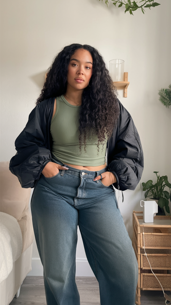 Combining monochromatic earth tones with casual layering, this outfit stands out as a go-to for laid-back spring curvy styles. The ribbed olive green cropped tank highlights the waistline, while an oversized black windbreaker introduces a sporty, effortless feel. High-rise utility denim adds structured yet relaxed volume, perfect for apple and pear body shapes. Ideal for casual meetups or bustling outdoor markets, this ensemble offers style without sacrificing freedom of movement.