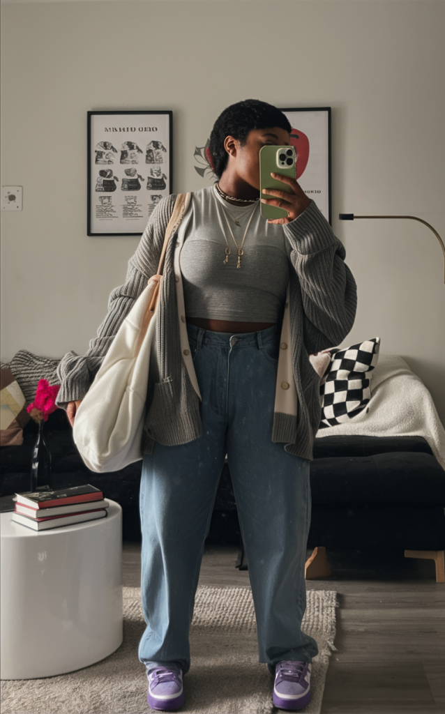 - Oversized cardigan: Soft, cozy texture adds flowing balance.
