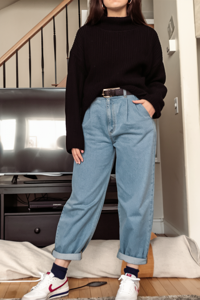 Classic Black Sweater with Relaxed Denim and Sporty Sneakers