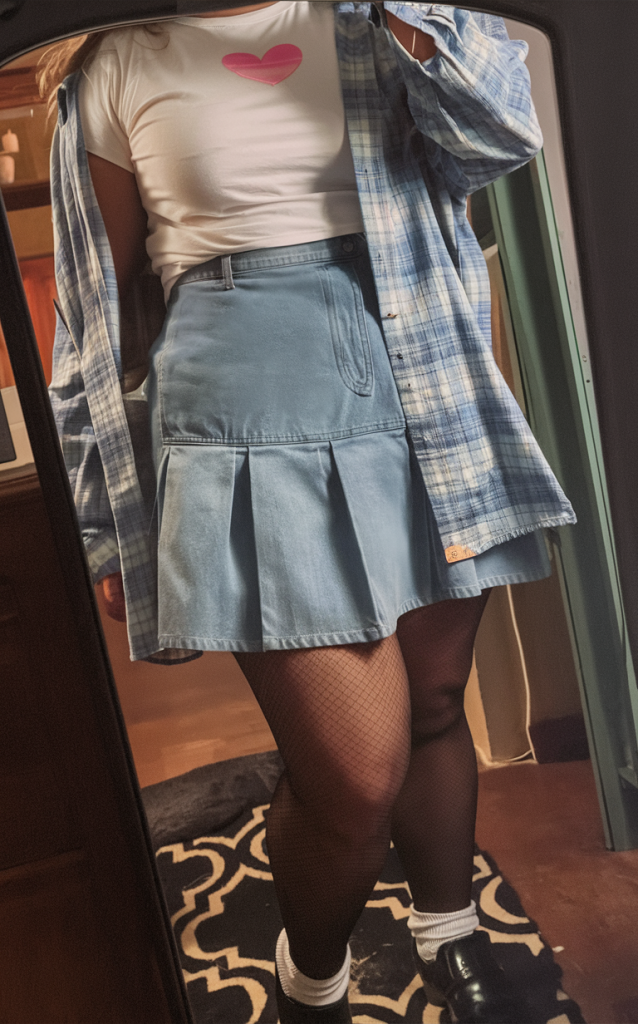 - Pleated denim skirt: Adds feminine shape and playful movement.