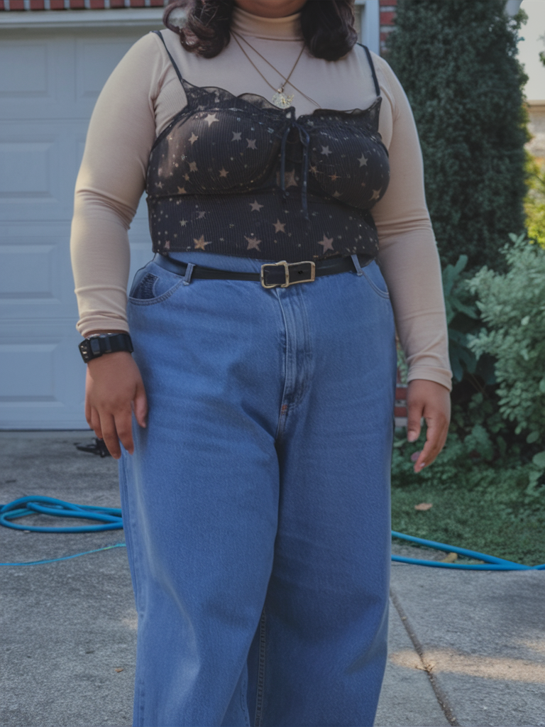 With a touch of whimsy and refined polish, this starry corset top layered on a neutral long-sleeve is a unique statement for midsize curvy styling. Loose-fit high-waisted jeans provide a laid-back yet balanced silhouette, while layered necklaces and a leather belt complete the celestial-inspired look. Ideal for both daytime adventures and subtle evening outings.