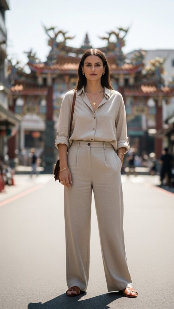 Humidity is no joke in Taiwan, especially during warmer months, so natural fibers like linen become your best allies. A coordinated linen outfit—think matching loose pants paired with a breezy button-down or a softly draped blouse—strikes the perfect balance between elegance and practicality.