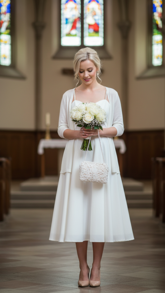 Nude pumps enhance your legs’ length visually, adding to the refined sensibility. Build a harmonious monochrome look with matching accessories—think soft cream cardigans, light gold jewelry, or a delicate pearl necklace. A nude structured handbag adds polish, making this ensemble ideal for transitioning from service to afternoon festivities. This refined yet modest elegant church dress concept is well-suited for various religious occasions beyond Palm Sunday.