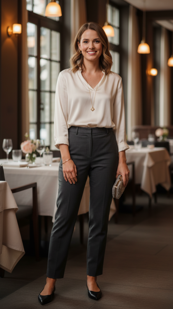 Tuck in your blouse precisely to sculpt your figure, and opt for kitten heels or pointed flats to balance style and comfort throughout dinner. Minimalist jewelry like stud earrings and a sleek watch enhance a polished, celebration-appropriate vibe.